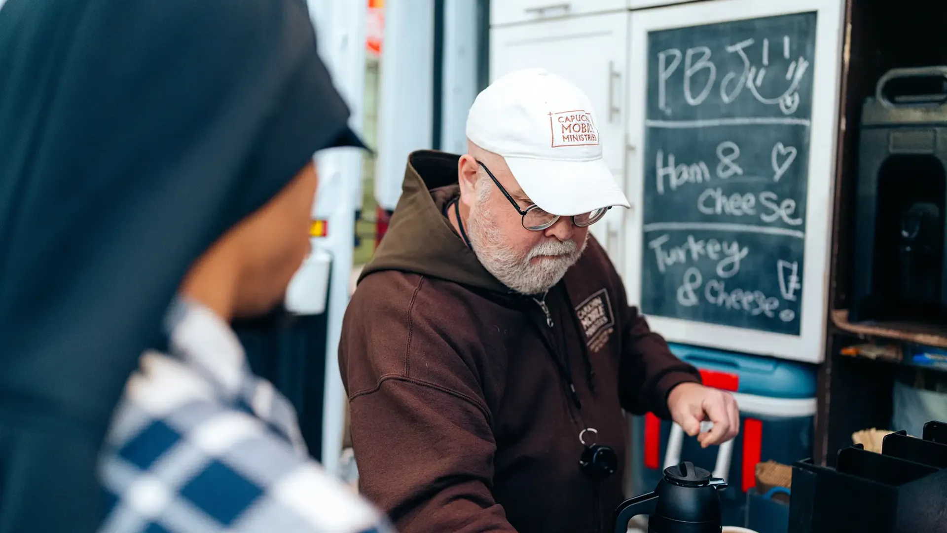 On Thursday in Harvard Square, a half-dozen people ventured over to the van for food or supplies. The group stays at each stop for 20 minutes, and often one of the brothers will scout the area on foot after they arrive, to alert people to their presence, and to bring them supplies if they don’t want to come to the van. “It’s important to walk around, because people see us, even if we don’t see them,” Fesefeldt says. Soon after the group set up, a youngish man made his way over and, after perusing the menu, asked for a ham and cheese sandwich. A few minutes later, a woman pushing a wheeled utility cart filled with two heavy bags approached hesitantly. She accepted a sandwich but said that what she really needed was socks and gloves—did they have any? Another man came over smiling, and after receiving a cup of coffee, stayed and chatted for 15 minutes, talking and laughing, half in Spanish, half English.