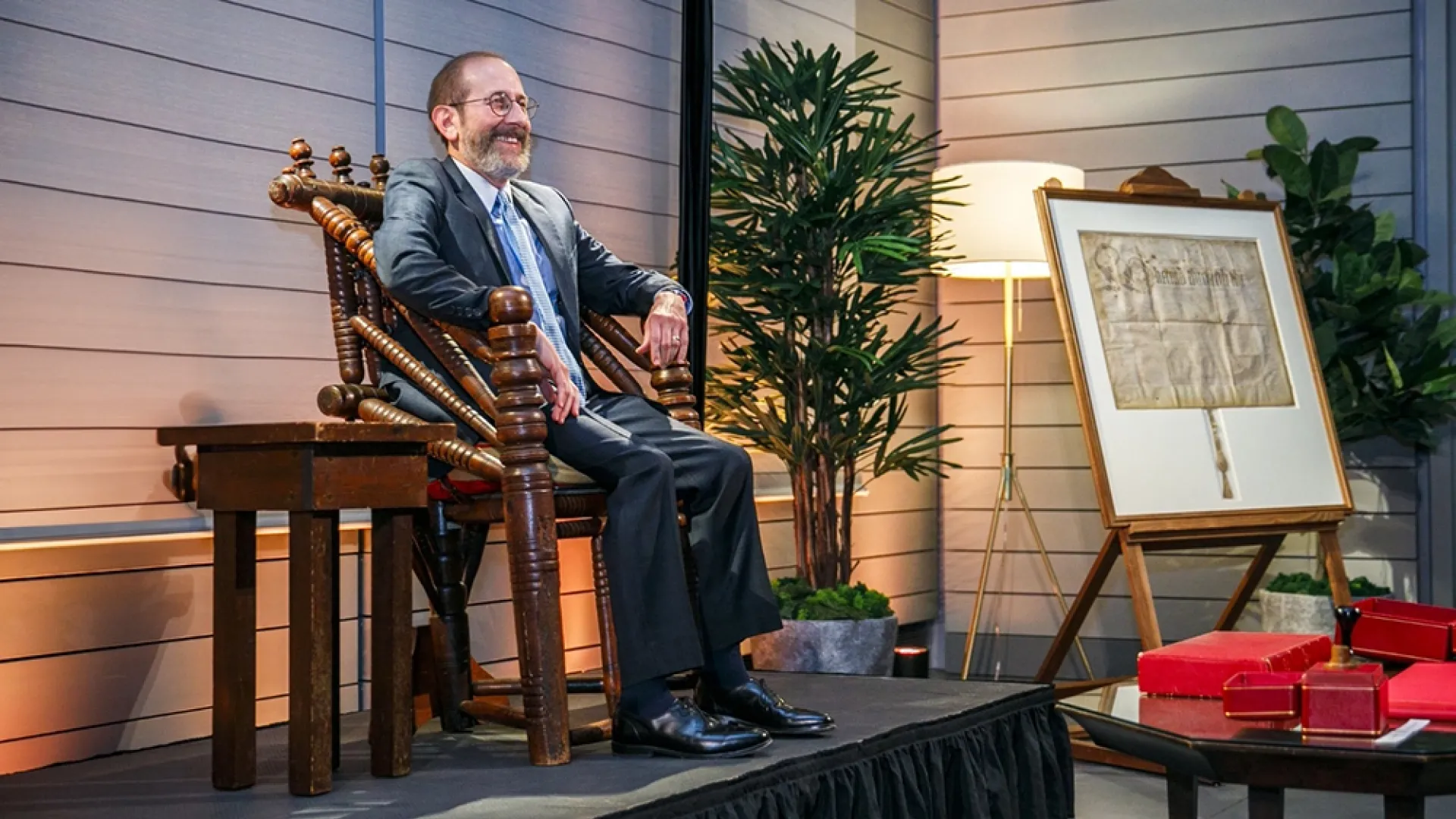 Alan M. Garber—named interim president on January 2, 2024, and the University’s thirty-first president (through June 30, 2027) the following August, was honored with a private installation ceremony at the Harvard Art Museums on Saturday evening, December 7. The event was attended by friends, family, members of the governing boards, deans and other University leaders, and four of Harvard’s six living former presidents—Lawrence Bacow, Drew Faust, Claudine Gay, and Lawrence Summers—who were on hand to present the symbols of authority, including the Charter of 1650. In his low-key remarks, Garber joked about another symbol of the office, and the circumstances under which he exercises its responsibilities: commenting on the notoriously uncomfortable Holyoke Chair, the turned sixteenth-century seat from which the president presides during the annual festival rites, he said, “[I]t’s not as uncomfortable as I expected it to be, but it was surprisingly warm when I sat on it during Commencement. It seems to be growing hotter by the day.” Read a full account, including his complete text, at harvardmag.com/garber-installation-24.