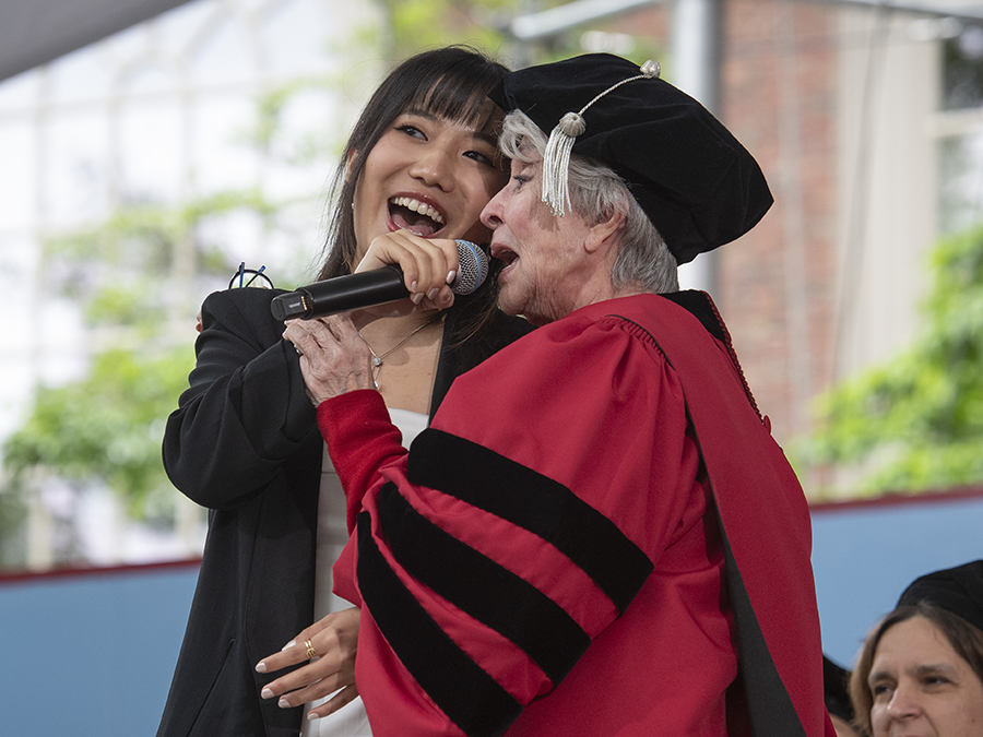 Thursday’s ceremony also included an indelible musical moment that nodded to the values of welcoming and hope: a student rendition of “Somewhere,” from the musical West Side Story, which brought one honorary degree recipient and some in the audience to tears.