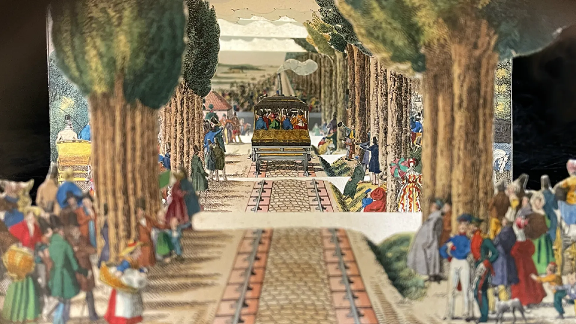 Look through the hole, and a world appears in miniature: a train chugging down a tree-lined track, pedestrians and horse-drawn carriages bustling on either side. This optical illusion is a “paper peepshow”—a device that layered paper cutouts to create a three-dimensional scene. During the eighteenth and nineteenth centuries, these tiny theaters captivated crowds in salons, village squares, and fairs across Europe. Relatively few of the fragile creations survive, but two are housed at Harvard Business School’s Baker Library.