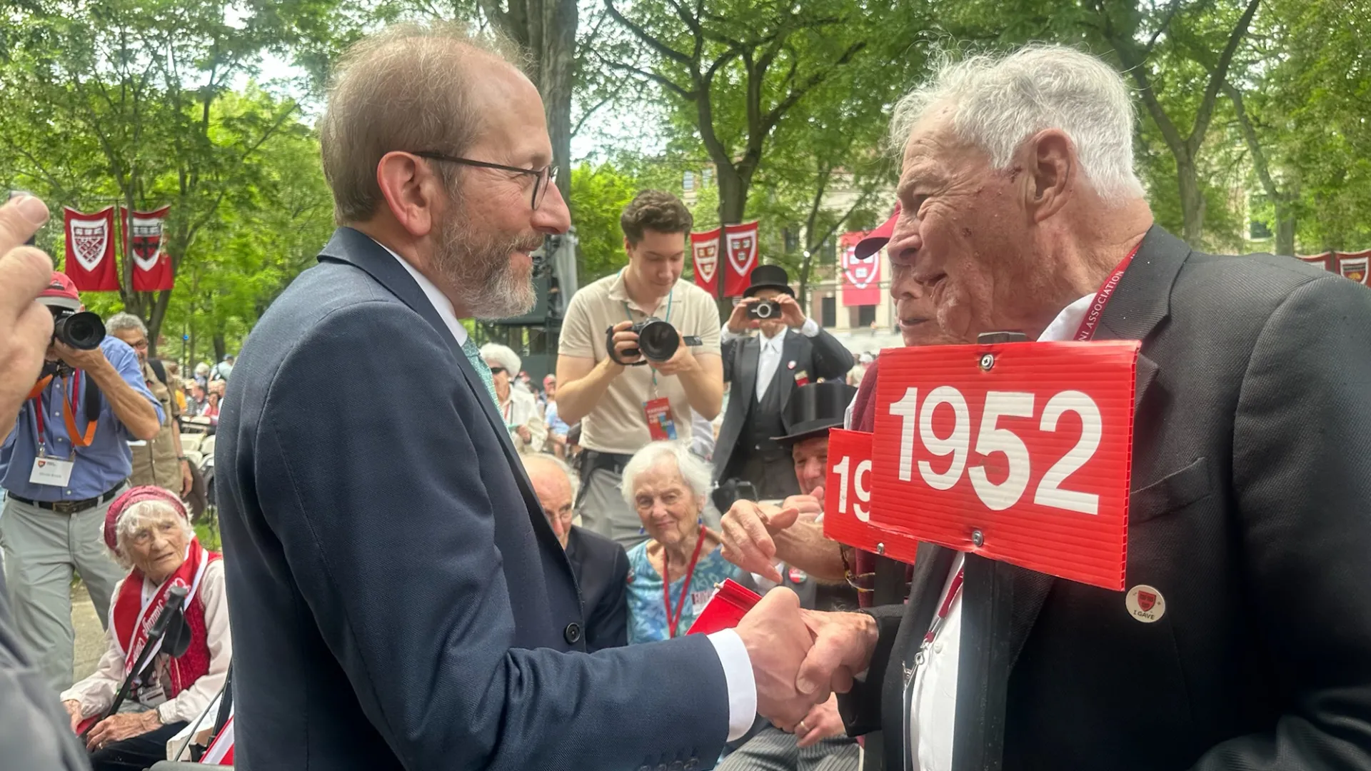 The 2025 rendition of Harvard Alumni Day, which brought around 9,000 alumni to Cambridge, felt more like a campaign rally than a reunion. Signs around the yard asked alumni to support Harvard (“Stay Informed. Advocate. Give.”). Alumni donned pins reading “Speaking to power” and “We are Harvard” and stickers reading “Crimson courage.” Three times, attendees stood and cheered for President Alan M. Garber, who has become the face of Harvard’s fight with the federal government. And while President Donald Trump’s name was never mentioned, several speakers directly critiqued his administration—its attacks on foreign students, its stripping of research funding, and its dismantling of the U.S. Agency for International Development (USAID).