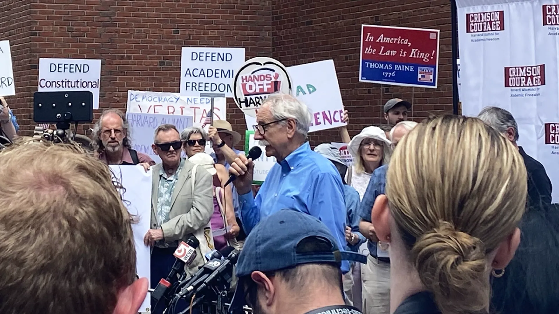 Outside the district court in Boston’s Seaport district, a crowd of more than 50 Harvard supporters gathered in a rally organized by alumni group Crimson Courage.