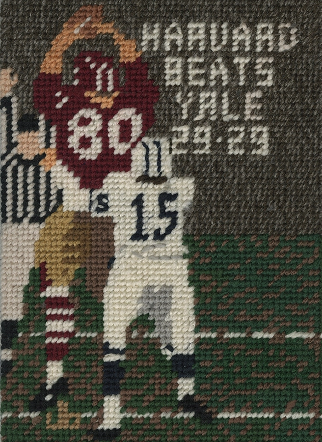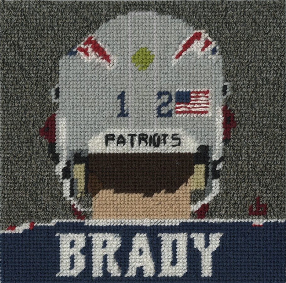 Few images in modern sports are more familiar than the back of New England Patriots No. 12: Tom Brady’s navy blue jersey, his silver and red helmet, his strands of close-cropped brown hair. But seeing them in needlepoint—woven in tiny, exquisite detail by Harvard hockey legend Joe Bertagna ’73—is like seeing them for the first time.