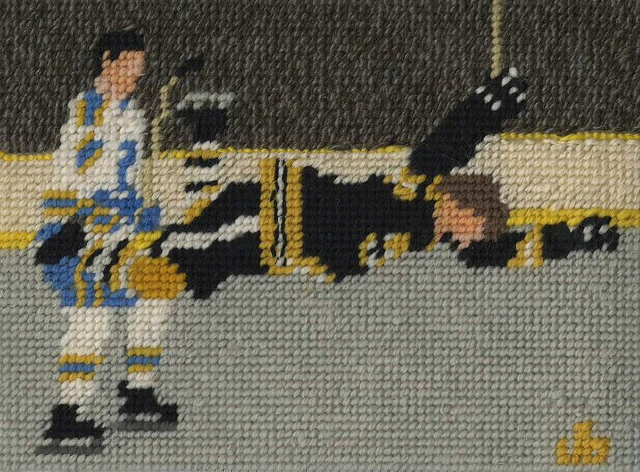 Completing the Sports Museum project has pushed Bertagna beyond his needlepoint comfort zone, prompting him to delve into different sports and more intricate designs. “I’ve spent my whole life in hockey, so I have a better familiarity with it,” he says. “When you’re looking at something, a picture’s a picture, but if you understand how [jersey fabric] folds and equipment feels, you can have a better grasp.”