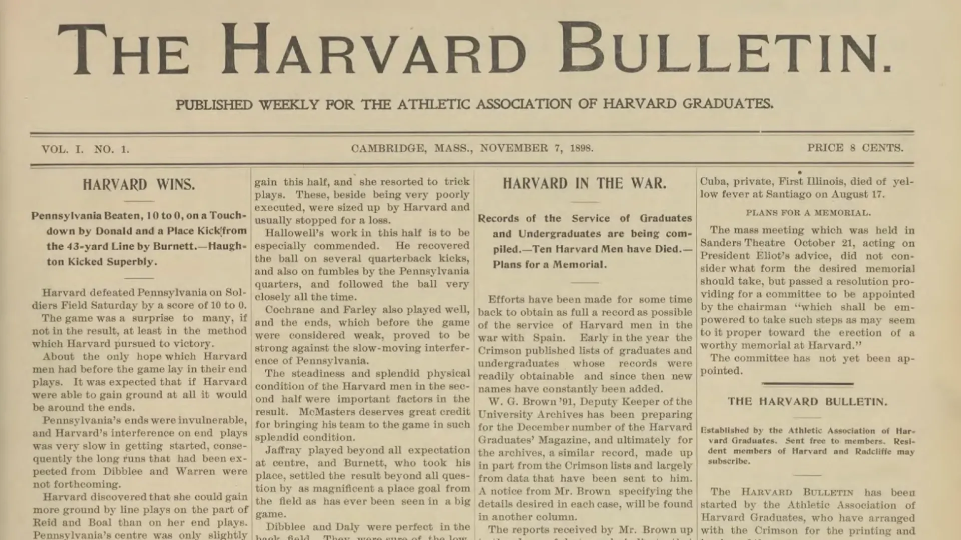 Founded on November 7th, 1898, Harvard Magazine holds the distinction of being one of the oldest alumni magazines in the United States. Originally launched as The Harvard Bulletin, it began as a four-page weekly publication priced at $0.08 a copy (or $2 per year, which comes to roughly $78 in 2025).