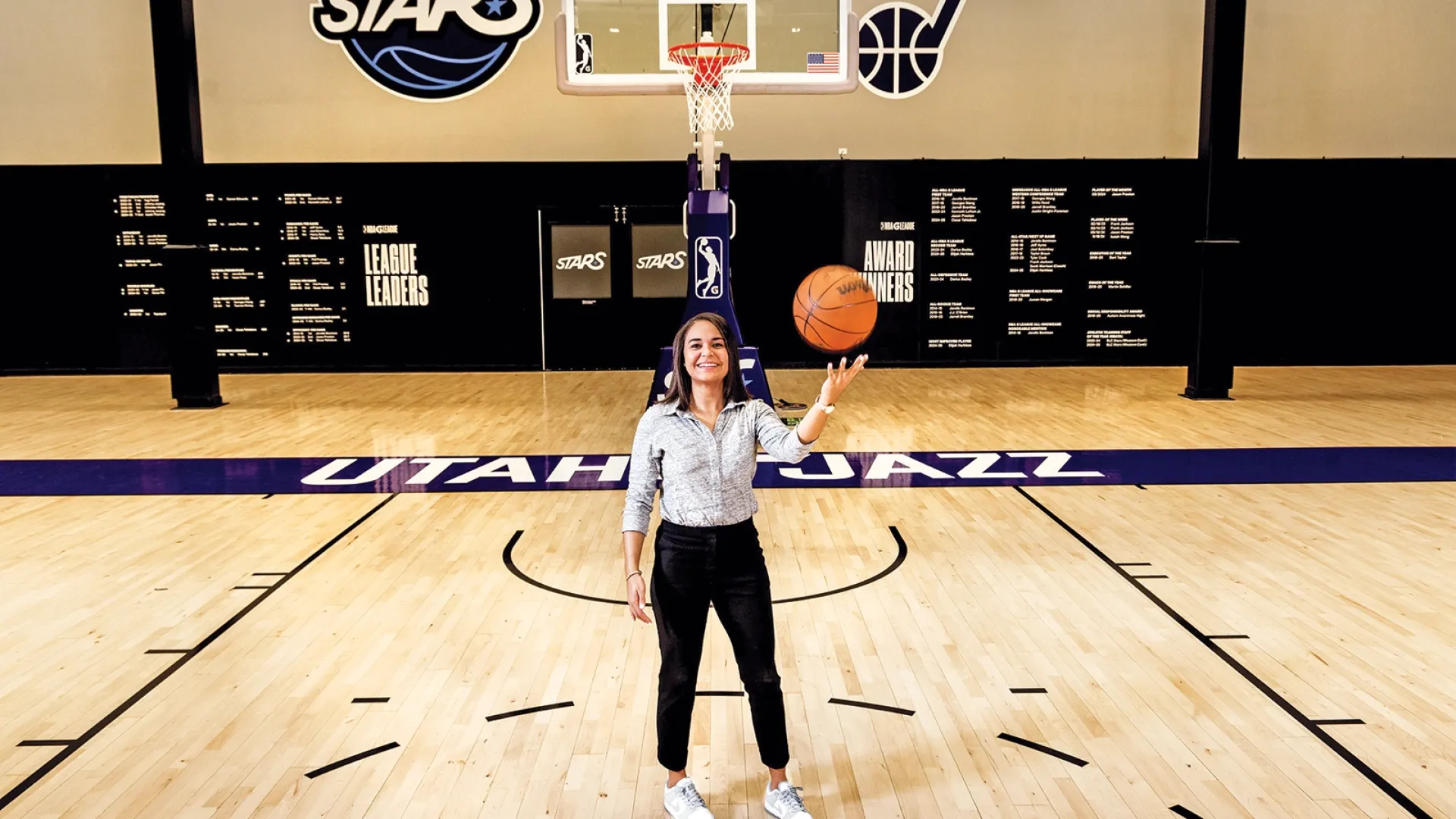 On a Friday evening in January, Katie Benzan ’20, the general manager for the Salt Lake City Stars—a minor-league affiliate of the Utah Jazz—sat along the baseline at the Portland Expo, pumping her fist as a Stars player soared for a dunk against the Maine Celtics. The youngest female general manager in the history of the G League (the NBA’s minor league), Benzan was 27 when she got the job last June.