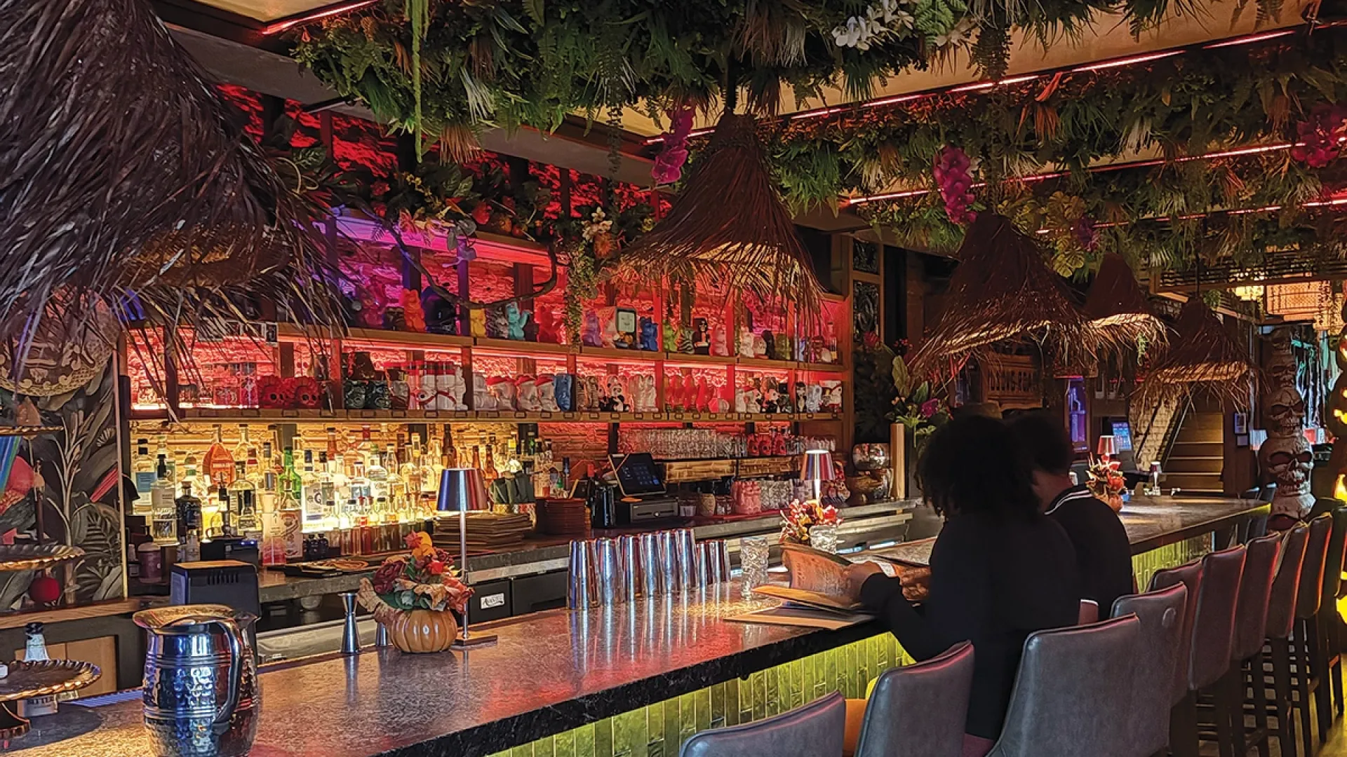 By contrast, Harvard Square’s Wusong Road is packed with fake stuff, but feels very much alive. Faux flowers and vines spring from every corner amid tiki hut decor. At the bar, patrons can order from the pan-Asian menu and pick out kitschy glassware—cobras and kitty cats share space with skulls—for their fruity tropical drinks. Share Scorpion Bowls and Singapore Slings or try the rarer “Breath of the Dragon,” made with tequila, mezcal, and dragon fruit and strawberry-infused Campari. The whole South Pacific/Asian/tropical vibe and exuberant decor make this a prime escape from worldly woes.