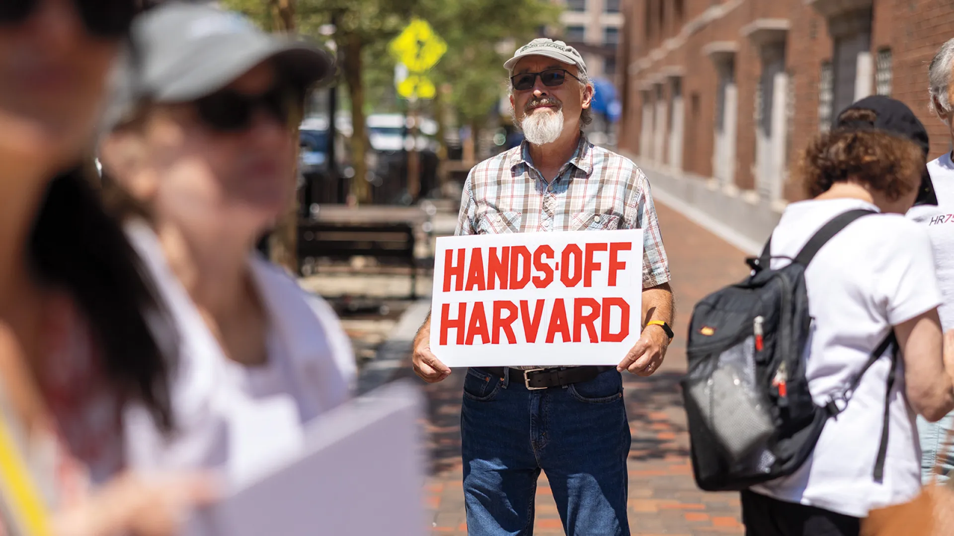 Man, standing in small group of people outside the courthouse, holding a sign that reads "HANDS OFF HARVARD" in red letters