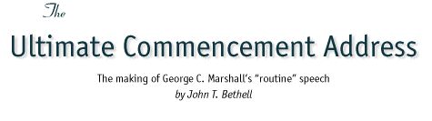 But few grasped the historic dimensions of Marshall's words. Press-relations officers at the University and the State Department advised reporters that the address was "a routine commencement speech" (see related story). A headline in the next day's New York Times read, "Marshall Pleads for European Unity." Years later, President Conant would state in his memoirs that he had not understood the import of the speech.