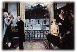A dream and its investigators in a painting by Paul Delvaux (L'Ecole des Savants, Vienna Museum of Modern Art). The dream itself appears at center-stage, while a psychoanalyst observes a patient on the right and a neurologist examines a dead brain on the left. The painting suggests Delvaux was not optimistic about either approach, preferring to celebrate rather than resolve the central mystery. Painting by Paul Delvaux; MUSEUM MODERNER KUNST, STIFTUNG LUDWIG, VIENNA