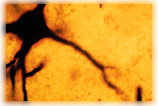 In REM sleep, large brainstem neurons like the one shown above fire sustained bursts of impulses that excite much of the brain. These impulses, also associated with the rapid eye movements that characterize REM sleep, have been recorded on the large display to the left.