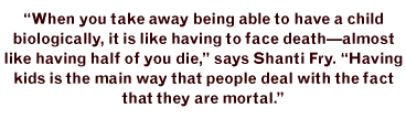 "When you take away being able to have a child biologically, it is like having to face death--almost like having half of you die," says Shanti Fry '73, M.B.A. '85, a corporate finance director at BancBoston Securities. She speaks from experience, for she tried unsuccessfully for eight years to get pregnant using the full range of infertility options. She and her husband, Jeff Zinsmeyer, are now the proud parents of their daughter Victoria, age 3, whom they adopted in China. Infertility may not be life-threatening in the literal sense, says Fry, "but it does affect people's view of their own mortality, because having kids is the main way that people deal with the fact that they are mortal. And it's very hard for people who haven't been through it to understand the magnitude of that."