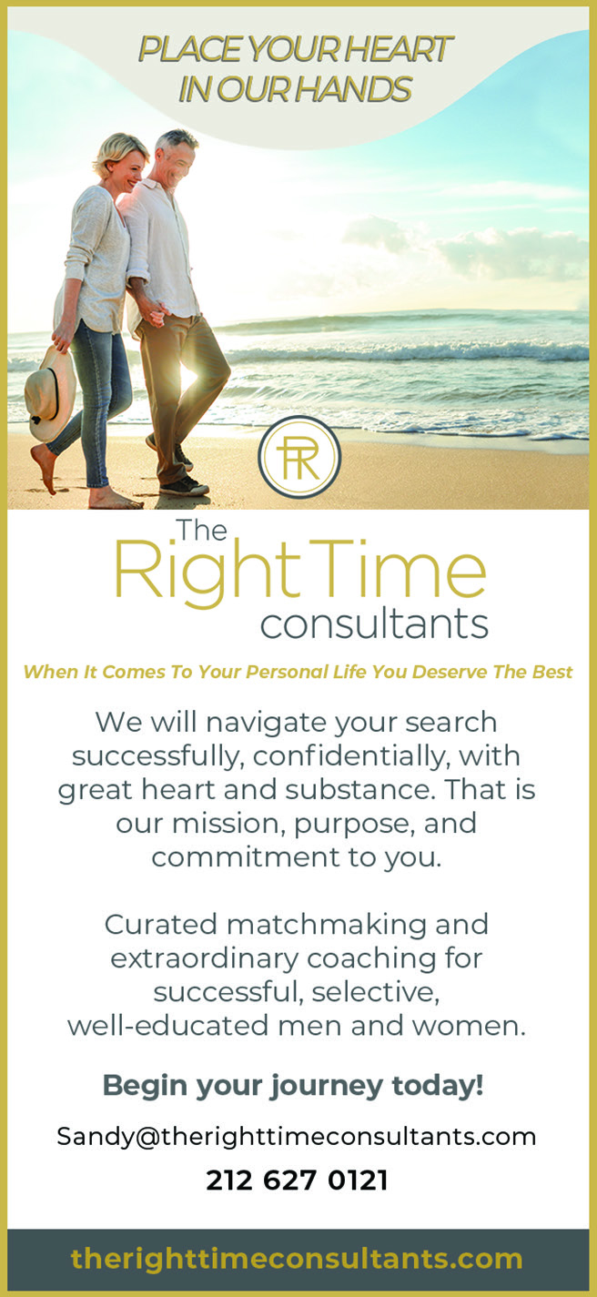 Place Your Heart in Our Hands. The Right Time Consultants. When it comes to your personal life, you deserve the best. We will navigate your search successfully, confidentially, with great heart and substance. That is our mission, purpose, and commitment to you. Curated matchmaking and extraordinary coaching for successful, selective, well-educated me and women. Begin your journey today! Sandy@therighttimeconsultants.com, 212-627-0121. therighttimeconsultants.com.