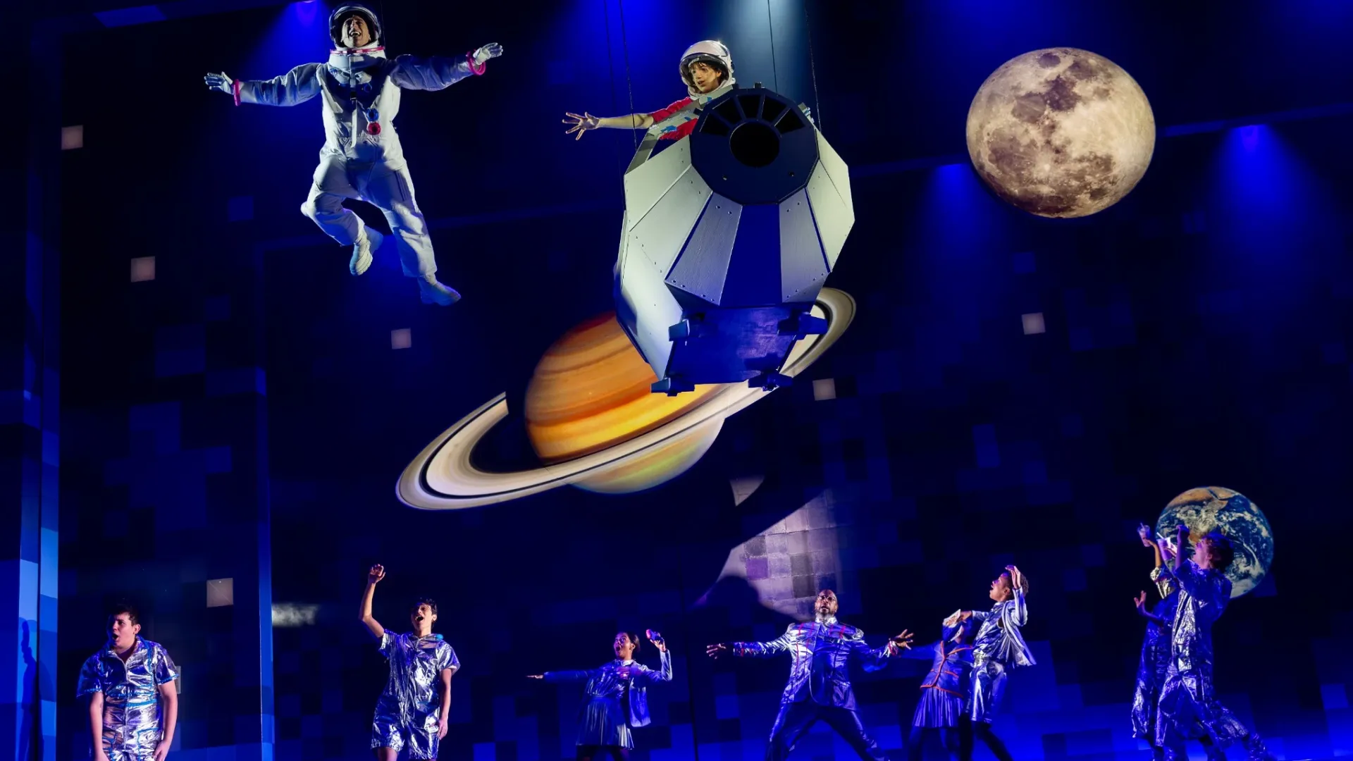 The A.R.T. production, which runs from December 12 through February 8, was shaped in part by consultation with advocates and individuals with craniofacial differences. Those conversations with Dina Zuckerberg, Matthew S. Joffe, and Pat Chibbaro helped to guide casting, development, and Ruhl’s approach to the material. Ruhl’s adaptation remains faithful to the book, but rearticulates it through song and dance; one of the production’s most sustained interpretive choices is its reliance on the imagery of outer space.