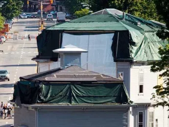 To accommodate Harvard Law School’s large new building, an existing garage and dormitory had to be razed. But three historic wooden buildings were saved, making a gingerly trip up the closed Massachusetts Avenue on the weekend of June 23-25—their weight …