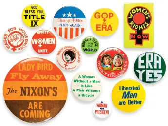 Tiny pins with their delicate metal fasteners still intact, some more than 100 years old, read “Votes for Women” and “I March for Full Suffrage” in faded letters. Some sit in miniature carrying cases, signifying, perhaps, that they once meant a great deal …