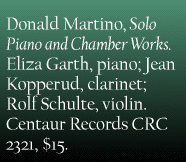 There should be a german word for the feeling that descends upon arriving at a recital to find a modern composition on the program--something like Schadenschoenalbanberg. It's a combination of fear and loathing that even serious classical music enthusiasts don't feel ashamed to express. Contemporary music can sound so insular, as though it had nothing to do with an audience; and this perceived snobbery leads to audiences dismissing the music out of hand. Part of the effort to stem this growing alienation must include recordings like pianist Eliza Garth's new compact disc of solo piano and chamber works by Bigelow professor of music emeritus Donald Martino.