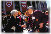 The oldest graduate to march in the alumni procession on Commencement day was artist John Heagan Eames '22, of Boothbay Harbor, Maine, just shy of 99, shown being greeted by Radcliffe president Linda Wilson. Eames's elders include Elizabeth Maxwell Sabin '17, 104, of Hingham, Mass.; Dorothy Summers Green '17, 103, of Lexington, Mass.; E. Pollak-Ottendorf '21, 103, of Bronx, N.Y.; Ralph E. Allen '20, 103, of Des Moines, Wash.; Charles Hartshorne '21, 102, of Austin; Gertrude Knowlton Wilson '21, 100, of Madison, Wisc.; Stephen E. Freeman '19, 101, of Shelburne, Vt.; Horace Bancroft Davis '20, 100, of Chicago; Elizabeth Benton Swain '20, 100, of Hingham, Mass.; and Bryson Findley Graham '19, 100, of Zanesville, Ohio.