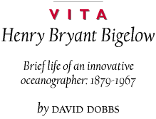 So, according to his memoirs, went the conversation that kicked Henry Bryant Bigelow '01, Ph.D. '06, S.D. '46, out of a rut and onto the Gulf of Maine, which he would transform from a scientific unknown to one of the most thoroughly studied large bodies of water in the world--and in doing so, set modern oceanography on an "interdisciplinary," "ecosystemic" course before either term existed. Bigelow developed a rigorous, integrative approach to oceanography that he eloquently propagated for decades. Along the way, he served what he reckoned to be the longest tenure in Harvard's history, working as a researcher, instructor, and professor of zoology from 1906 to 1962--for which he solicited and received, he recalled with typical humor in the memoirs, the only bottle of whiskey ever presented to anyone by the President and Fellows of Harvard College.