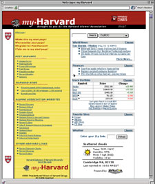 The individual user chooses the content on the right-hand side of the page, which might be given the general title "my•RealWorld." Users can display news headline, stock quotes (updated every five minutes), or the local weather forecast; a drop-down menu offers 14 Internet search- engines (many of which offer similar, customizable services); and "My•Harvard" can also keep track of appointments via a calendar function (not shown on the prototype at left). Herf says that one strength of "my•Harvard" is its flexibility.