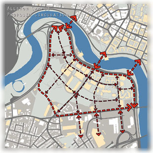 Other student proposals posited a series of seed projects along Western Avenue, including a gateway building--with a tower reminiscent of Harvard's river Houses--at the intersection with North Harvard Street, to give the sense that one is passing through a Harvard environment. One study suggested breaking apart a new museum proposed for a Cambridge site and redistributing it in Allston, connecting the structures with a series of tree-lined pedestrian corridors so that Western Avenue takes on a very landscaped appearance.
