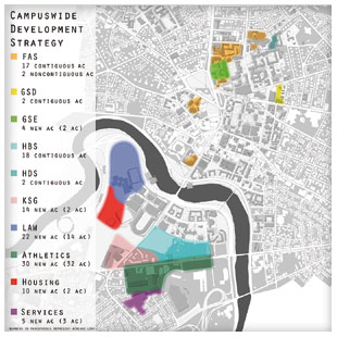 One of the most interesting proposals examined the program and space requirements of both the Cambridge and Allston campuses. "If we think about certain academic units in Cambridge relocating to Allston," Marshall says, "a whole series of questions need to be asked. The first is, 'Who would that be? What units could or would shift?' The next series of questions is, 'Why would they shift? What incentives would need to be put in place to make Allston attractive enough so schools would want to shift there?' If you shifted the law school, let's say, to Allston, that frees up space in Cambridge, so when you consider Allston, you have to consider the University in totality."