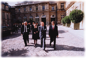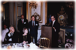 ![]() Harvard "came to" Paris on June 28 when the Harvard Club of France, the Harvard Business School Club de France, the Harvard Law School Association of France, and the Association des Anciens Boursiers Arthur Sachs à Harvard hosted a lecture and dinner in honor of President Rudenstine at the Palais du Luxembourg, seat of the French Senate, under the patronage of Président du Sénat René Monory. Looking on (left) as the president speaks are Senator Charles Jolibois, LL.M. '51, seated to Mrs. Rudenstine's right, and, standing beside Douglass Carver, Jacques Salès, LL.M. '67, who served as the evening's master of ceremonies and next year will become the first international president of the Harvard Law Alumni Association. |