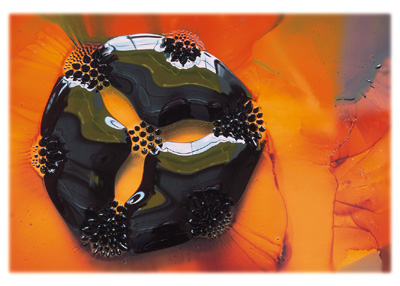 When placed in a magnetic field, the conflicting attractions of gravity, magnetism, and surface tension shape the ferrofluid. This drop of ferrofluid was placed on a glass sheet with yellow paper underneath for photographic contrast. Six small magnets were placed below the paper. In regions of high magnetic field, the fluid broke into spikes, trying to imitate the way iron filings line up in columns in a magnetic field. In regions of lower magnetic field it remained a liquid, forming flat drops in a compromise between the siren call of gravity and its own cautious cohesion. The result is shapes seen nowhere else in nature.
