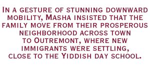 So indomitable was Masha's determination to keep her children insulated from the assimilative tendencies of middle-class Montreal Jewry that, in a gesture of stunning downward mobility, she insisted that the family move from the prosperous neighborhood of Westmount across town to Outremont, where new immigrants were settling, close to the Yiddish day school. "Totally against the stream, my mother. I inherited that characteristic, I guess." Indeed so. As we shall see.