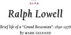 "I have lived my entire life in one area, I have been happily married for 45 years, and I have been in one business field," observed Ralph Lowell '12 in the fiftieth anniversary report of his Harvard class. "That is, I suppose, a picture of a 'Proper Bostonian.'" But Lowell, who also looked the part, was not just another cardboard figure out of Cleveland Amory's 1947 book of that title. By the early 1960s, Lowell was widely hailed as "Mr. Boston" for his service as a trustee of almost every important charitable, civic, and cultural institution in his native city. In 1973, Lowell was one of seven citizens officially recognized as "Grand Bostonians" for lives that "mirrored the spirit and dignity that have made [Boston] and its people so extraordinary."