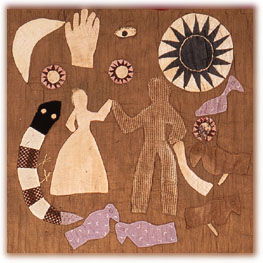 Adam and Eve, the serpent, Adam's rib, God's all-seeing eye, and His merciful hand. Detail of a quilt, made by Georgia seamstress Harriet Powers in 1886. Museum of Fine Arts, Boston. BEQUEST OF MAXIM KAROLIK. COURTESY, MUSEUM OF FINE ARTS, BOSTON |