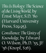 Two distinguished Harvard biologists, Agassiz professor of zoology emeritus Ernst Mayr and Pellegrino University Professor emeritus Edward O. Wilson, have turned their attention in recent years to very different projects. Mayr, an acknowledged grand master among evolutionary biologists, has, in his early nineties, written a synoptic overview of the science of biology. Wilson has attempted to resurrect (and sketch in) the Enlightenment hypothesis that all knowledge is--and may be demonstrated to be--unified.