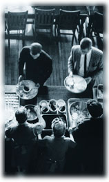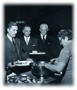 Mid-fifties chow lines: President Pusey (top, far left) and guests, students, round trays. PHOTOGRAPHS COURTESY THE HARVARD UNIVERSITY ARCHIVES |