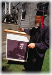 Jean-Louis Bourgeois '62, protesting Harvard's policy about honorary degrees, holds a photograph of his mother, Louise Bourgeois, who was to have been named a doctor of arts.