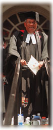 The sheriffs of Middlesex and Suffolk Counties, who came to Commencement on horseback, let it be known that they wished to ride into Tercentenary Theatre at the head of the procession, but the Harvard powers-that-be refused, despite assurances that the horses were used to crowds. Moreover, marshal's aide Peter McKinney, former associate dean, who would have marched behind the horses, allegedly refused to carry a push-broom. At 9:15, when the Commencement caller summoned the president's division to the line of march, the worthies fell in briefly behind the mounted sheriffs, prompting the caller to announce, "The president's division is now advancing, led by the cavalry." But the sheriffs, dutifully, soon dismounted. They evidently had so enjoyed their equestrian outing that they kept the horses on hand and rode them here and there in the Old Yard, aimlessly but harmlessly, at lunchtime. During the morning exercises, President Rudenstine called upon Middlesex sheriff James DiPaola, a ham, to intervene when degree candidates from the Business School cheered themselves excessively. The sheriff rose from his seat at the edge of the stage, strode imperiously forward, and demanded order, which did indeed ensue.
