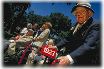 John T. Edsall '23, M.D. '27, of Cambridge, professor of biochemistry emeritus. Edsall joined the faculty in 1928 and made major contributions to understanding the physical chemistry of proteins, peptides, and amino acids, including red blood cell enzymes and proteins involved in blood coagulation. Here, he awaits the alumni procession.