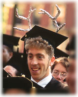 A mortarboard is an irresistible blank canvas for the creative. You may inform passersby that you "Need a Job" with a taped message on its top, for instance. Joel Pollak '99, of Skokie, Illinois, adorns his with aluminum-foil antlers as a loyal member of Dunster House, which bears the heads of three stags on its shield.