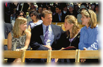 Kristin Gore '99, of Dunster House and Washington, D.C., between her parents, Mary ("Tipper") and Albert ("Al") Gore Jr. '69, LL.D. '94 (in his thirtieth-reunion year). At left is Karenna Gore Schiff '95, of New York City. With Sarah Gore a rising junior in the College, Harvard hasn't seen the last of these proud parents. The Second Family, despite the inevitable nimbus of security forces, did a good imitation of ordinary folks and was only a little molested by the press.