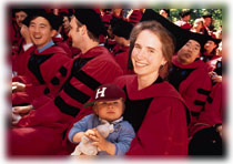 President Rudenstine welcomed 441 doctors of philosophy into the "ancient and universal company of scholars," among them Jennifer Kotilaine, Ph.D. '99, of Cambridge, whose field is music. She brought along son Henrik, 15 months, who appears to have academic aspirations. Photograph by Stu Rosner
