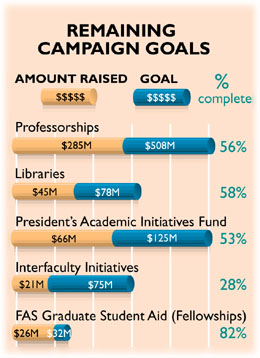 The university campaign finds itself in a curious position. By February 28, $1.975 billion had been received or pledged--close to the $2.1-billion goal set for the planned completion of the fund drive by year-end--and all the schools except one had exceeded their individual goals. Yet that one, the Faculty of Arts and Sciences, and especially the campaign's innovative funding for presidential initiatives and interfaculty programs, remain well short of their objectives. So do efforts to secure money for existing and new professorships, libraries, and fellowships for doctoral students.