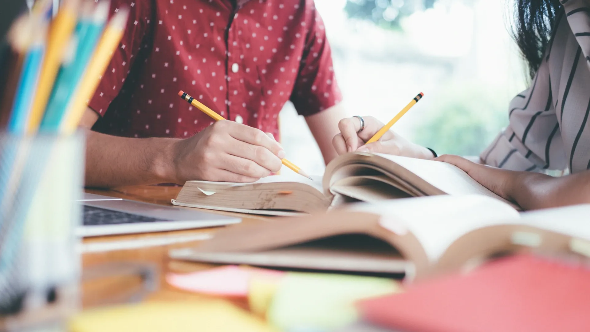 Young students writing with pencils on notebooks