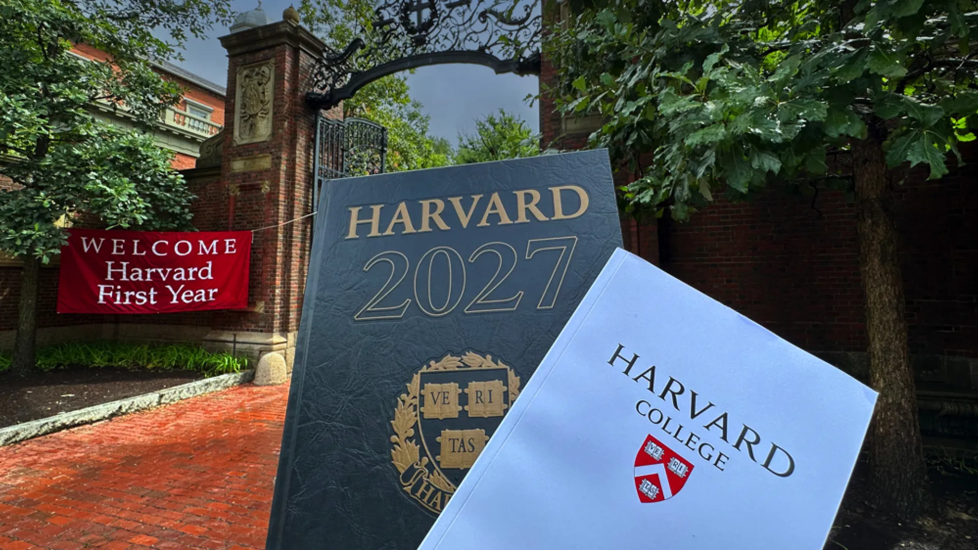 Harvard Gate in background with "Welcome Harvard First Year" red banner and in the foreground the Class of 2027 Class Book and Convocation program
