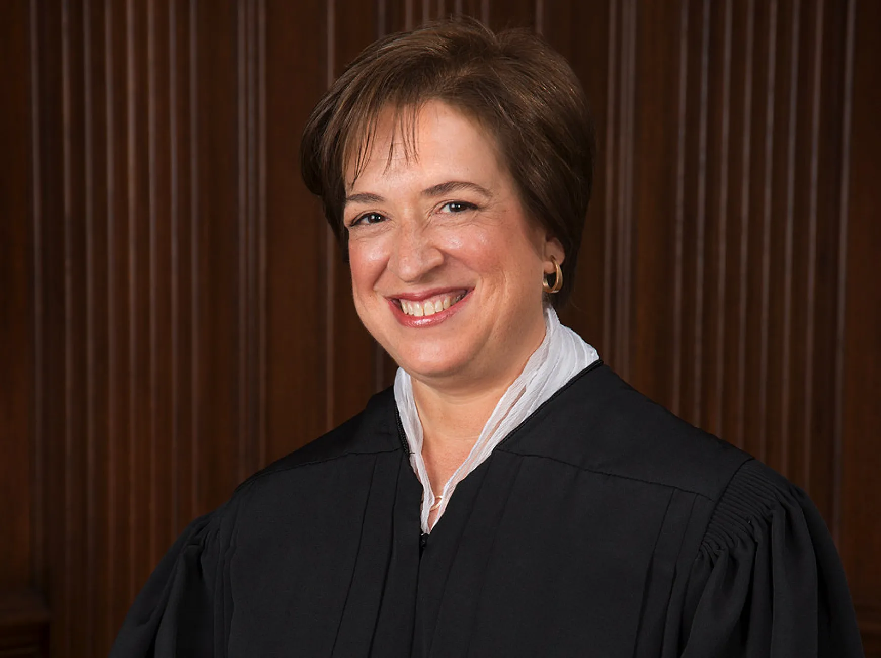 Justice Elena Kagan in a black robe, smiling against a wooden panel background.