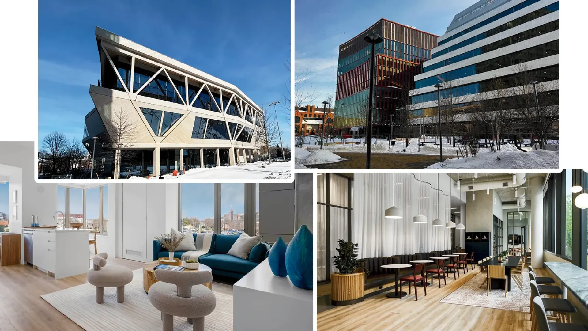 Gleaming buildings visible from Cambridge across the Charles River signal the transformation of an overgrown rail-truck transfer yard in Allston—now Harvard’s Enterprise Research Campus (ERC). The mixed-use development, led by real estate investment corporation Tishman Speyer on land leased from Harvard, was first envisioned in 2011 as a major installment in Harvard’s expansion into Allston. The red and silver buildings are the East and West laboratories and offices. Roche/Genentech, the global pharmaceutical company, has already leased a quarter of the approximately 400,000-square-foot space, still under construction inside. The company will begin a phased move-in during the summer.